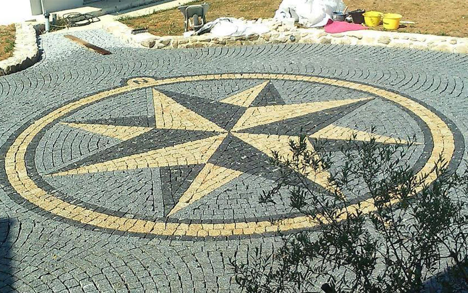 Portuguese sidewalk, made of granite, the entrance to the city of Gibraltar. ...