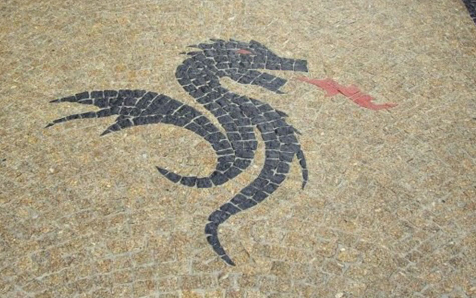 Calçada com dragão de granito em propriedade particular. Nesta obra foram utilizadas as referências: